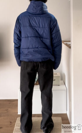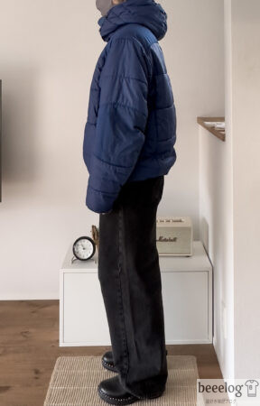 165cm/55kgで街着っぽく余裕あるシルエット。街着として着るなら、真冬でもインナーは薄手のフリースやニット、スウェットで十分です。